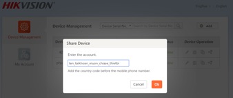 Điền tên đăng nhập, tài khoản email hoặc số điện thoại dùng để đăng ký tài khoản Hik-connect bạn muốn chia sẻ thiết bị (tài khoản giao cho khách hàng).